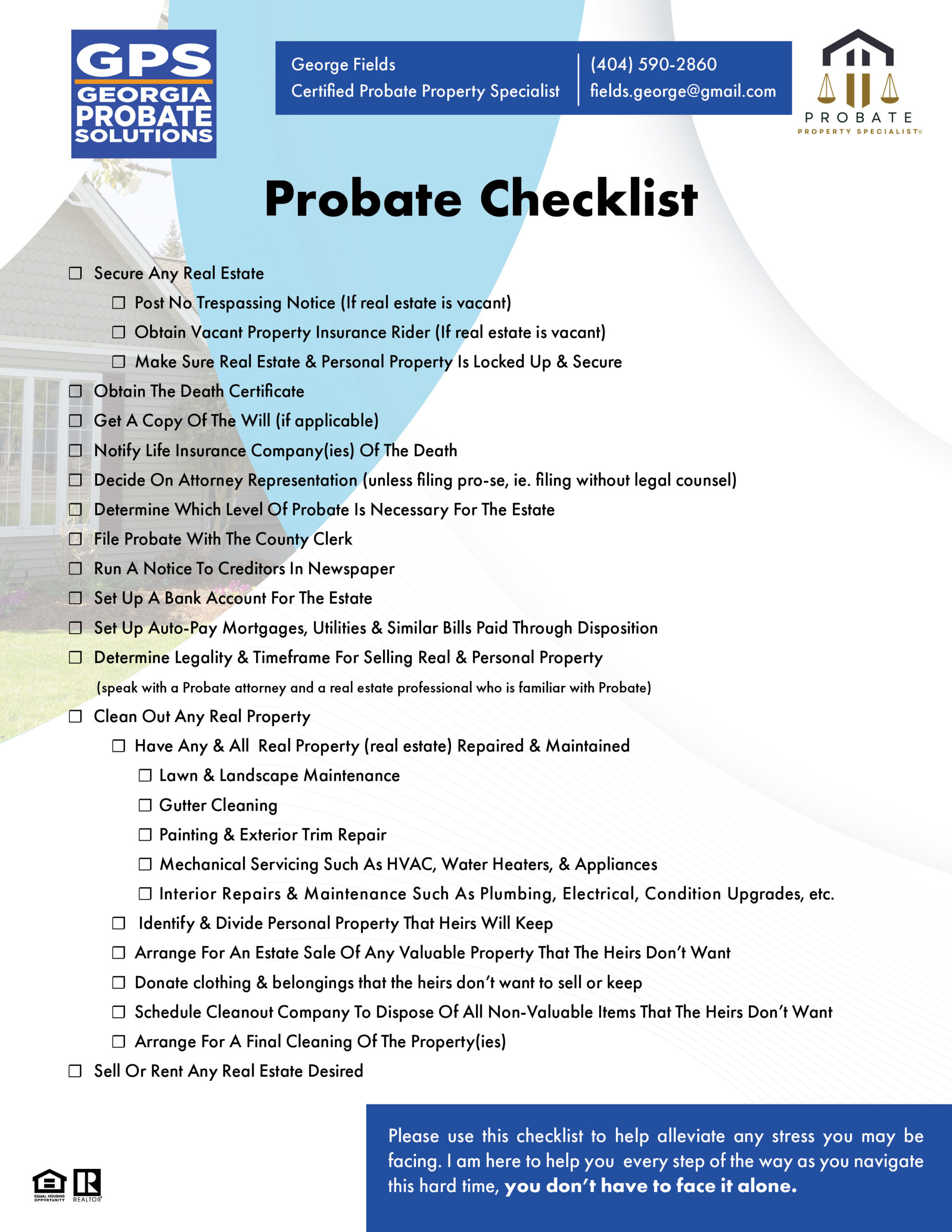 This is a checklist of some of the most common steps required when working though a probate case. While you should always consult an attorney to verify local and state laws and proceedings, this guide is an incredible resource to keep on hand.
